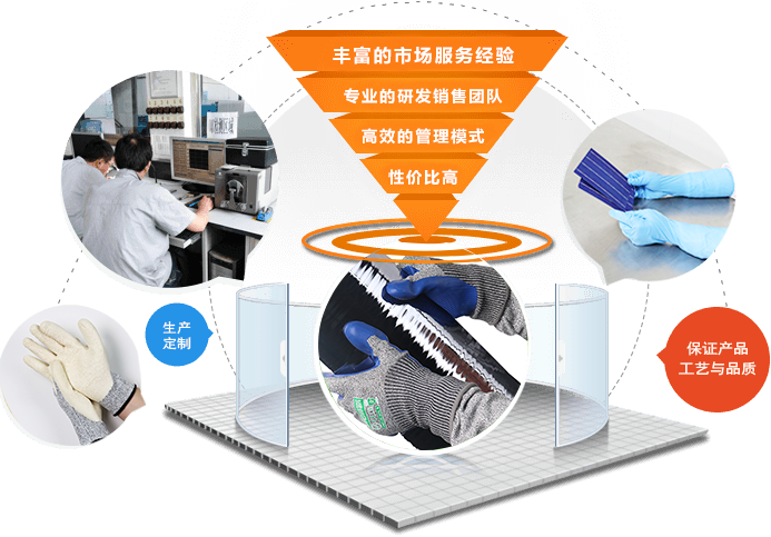 手套芯采用凱夫拉材質(zhì),經(jīng)權(quán)威機(jī)構(gòu)檢測屬于5級防割標(biāo)準(zhǔn),針織采用無縫針織,針織密度高,防止硅粉及金屬碎屑進(jìn)入手背,手掌涂層采用壓紋設(shè)計,具有良好的減震功能,手套制作完成以后經(jīng)過6次清洗工藝處理,經(jīng)權(quán)威機(jī)構(gòu)檢測表金屬雜質(zhì)低于45PPBW.